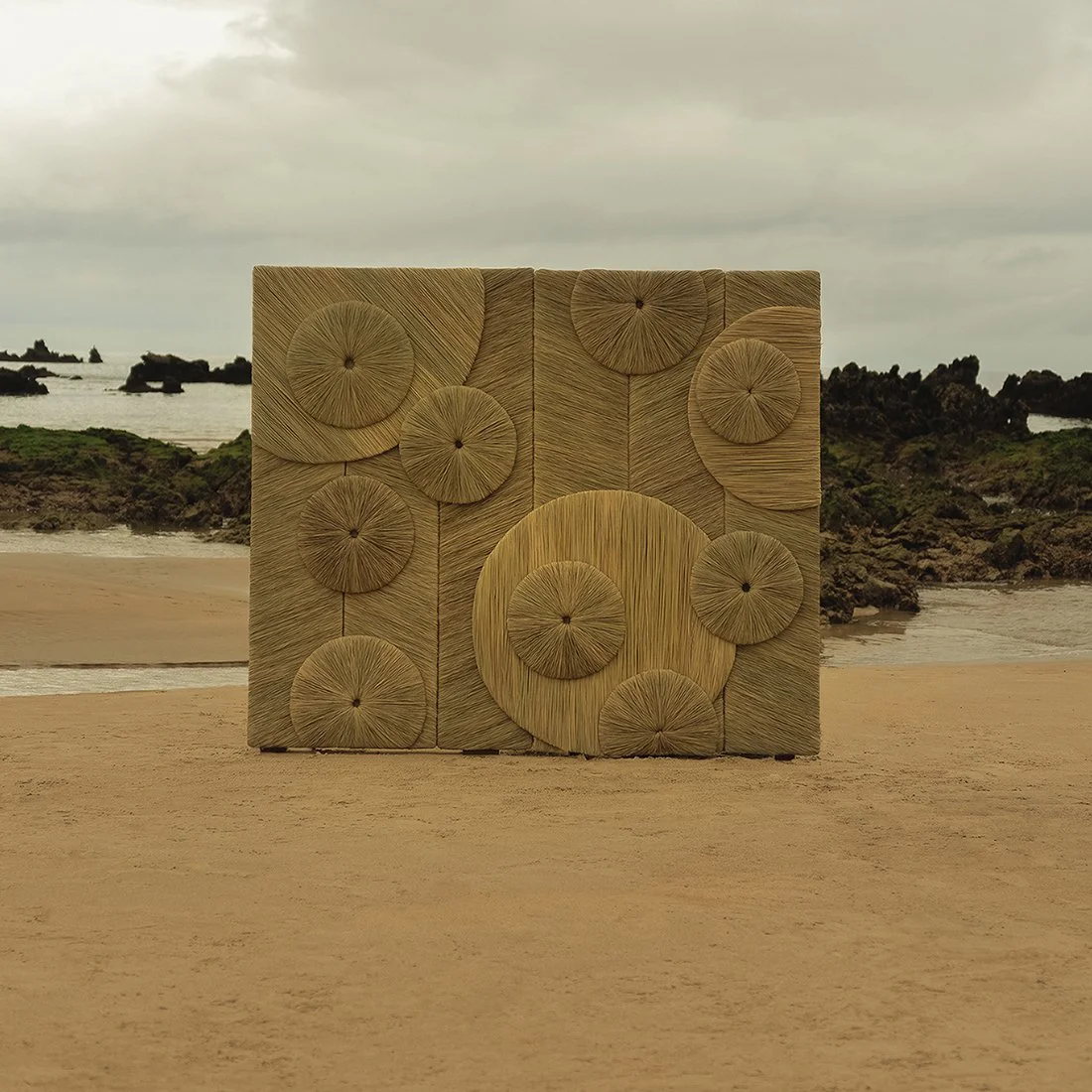 Engranaje “The gear”. With its concentric shapes, reminiscent of an eye, a wheel, or circles in the water, “Engranaje” almost invites touch as it presents a knotted texture, braced with all its natural roughness. By introducing the technique of basketry into the realm of the artwork, the eye conveys something akin to the tangible to the brain.